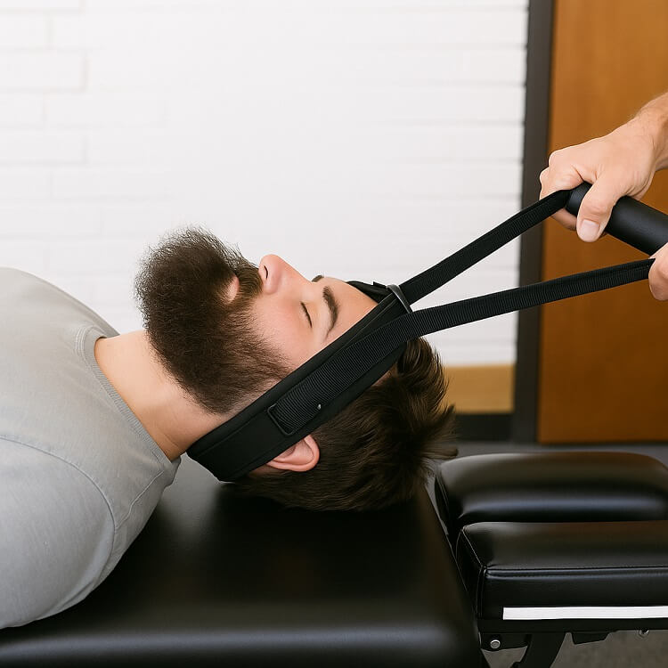 Your chiropractor will walk you through the process and make sure you feel comfortable before the stretch begins. The Y-Strap is placed around the back of the head and neck. A slow, steady pull is applied along the spine’s natural line. The motion is controlled, safe and designed to match your comfort level.